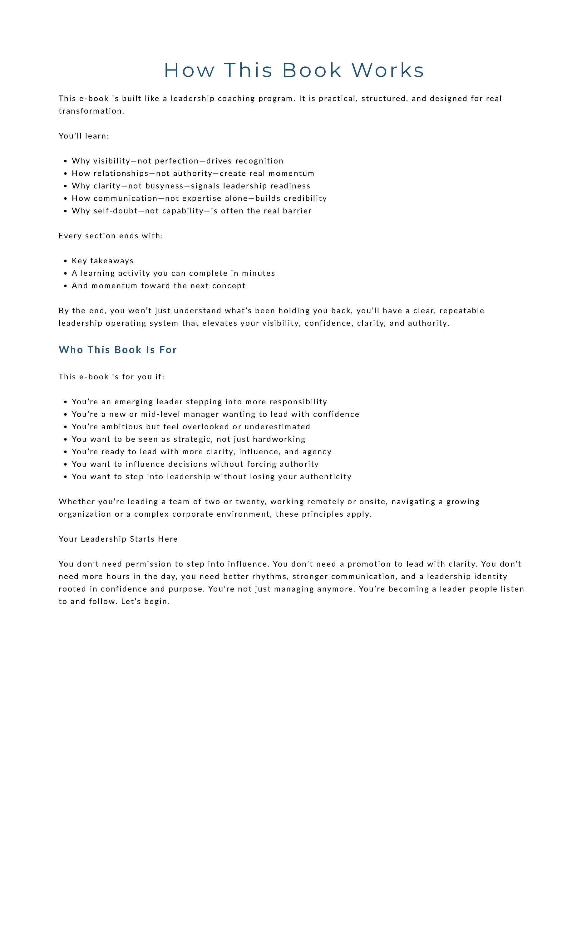Built like a leadership coaching program, this ebook gives you a clear, structured, and practical system to elevate your visibility, credibility, and authority at work.